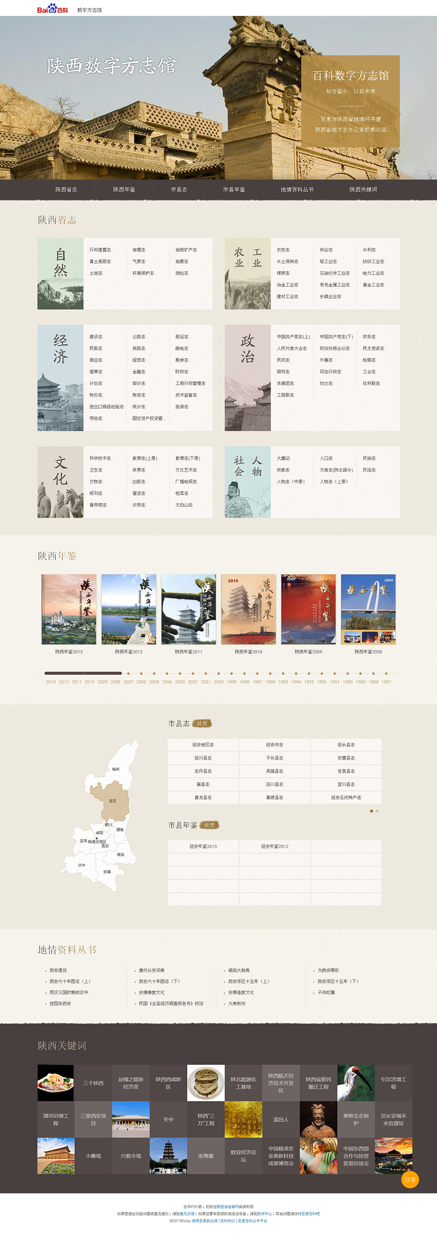 2015年4月7日,百度百科·陕西数字方志馆正式上线运行。“陕西数字方志馆”是陕西省地方志办公室与百度百科合作共建的创新项目,目前设陕西省志、陕西年鉴、市县志、市县年鉴、地情资料丛书、陕西关键词等板块,全方位、立体化、多层次地介绍了数千年的陕西历史。通过数字方志馆,人们可以自主选择感兴趣的领域,在短时间内搜索了解与陕西相关的各种信息,极大地丰富了陕西历史文化的传播手段和传播途径。