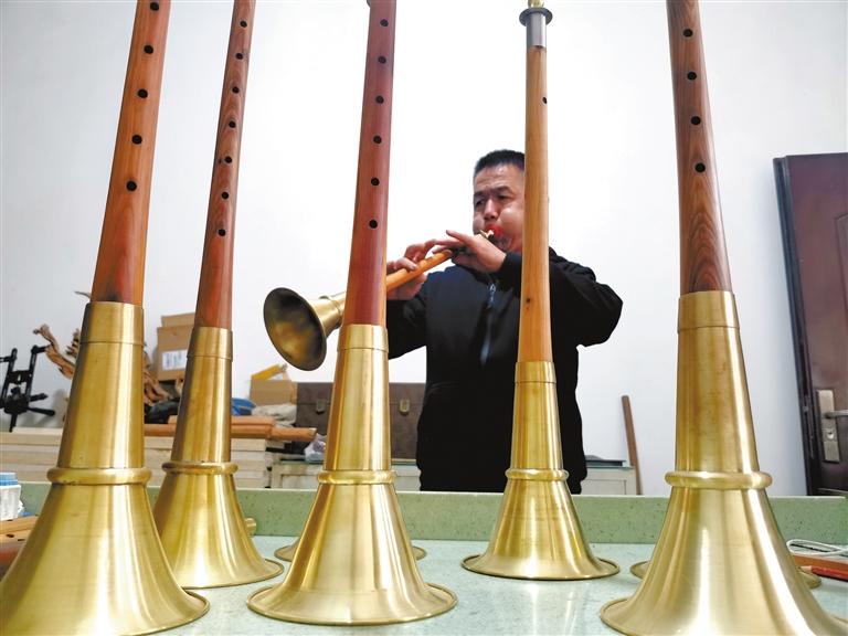 薛光华正在调试唢呐。 本报记者 陈宏江摄